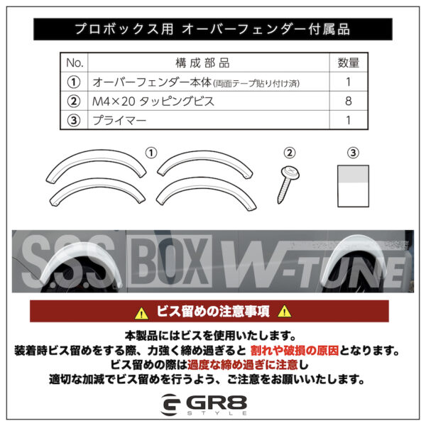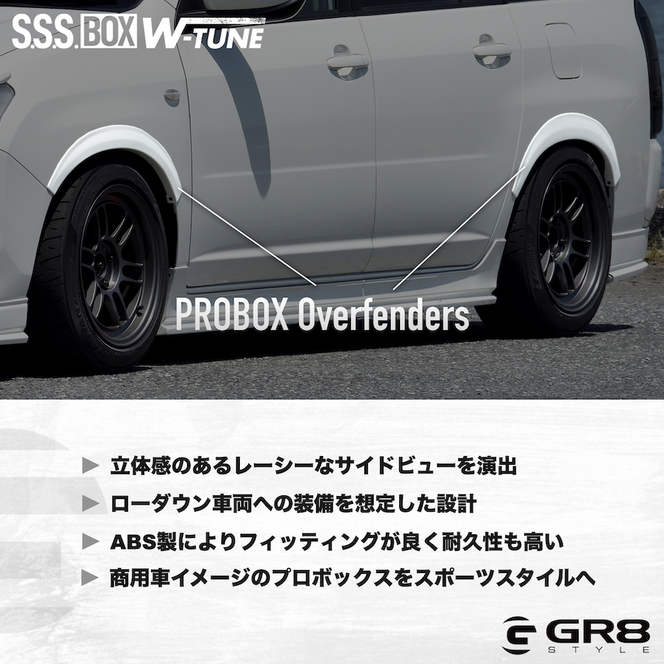 GR8 プロボックス専用のパーツシリーズ《S.S.S BOX W-TUNE》からオーバーフェンダーが登場。