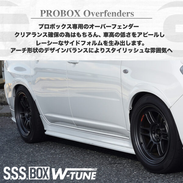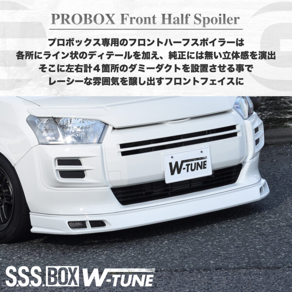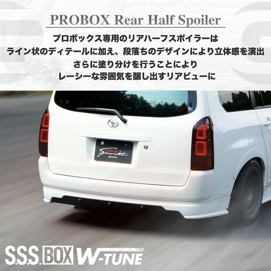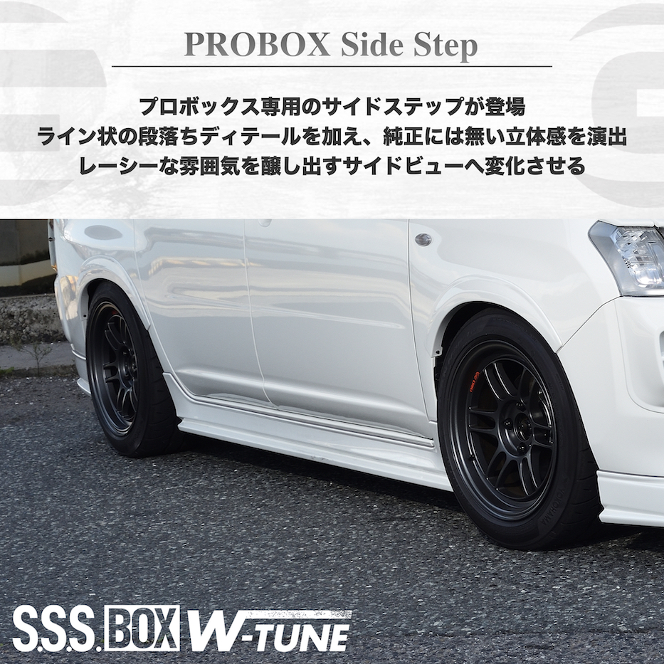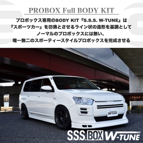 プロボックス専用のBODY KIT『S.S.S. W-TUNE』は『スポーツカー』を彷彿とさせるライン状の造形を基調としてノーマルのプロボックスには無い、唯一無二のスポーティースタイルプロボックスを完成させる