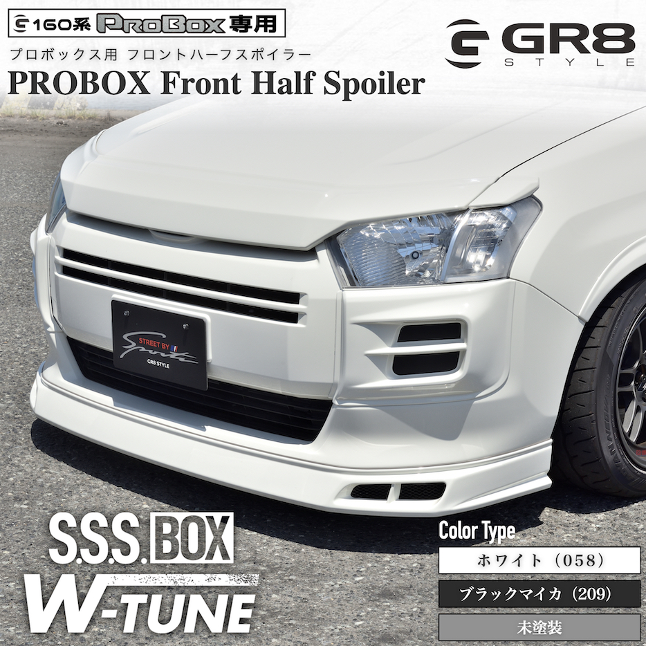 GR8 プロボックス専用のパーツシリーズ《S.S.S BOX W-TUNE》からフロントハーフスポイラーが登場。